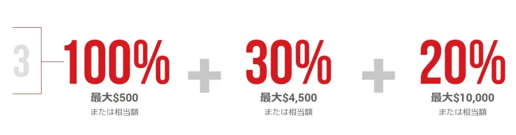 | ボーナス額 | 入金額の 100%+30%+20% (最大$15,000) |