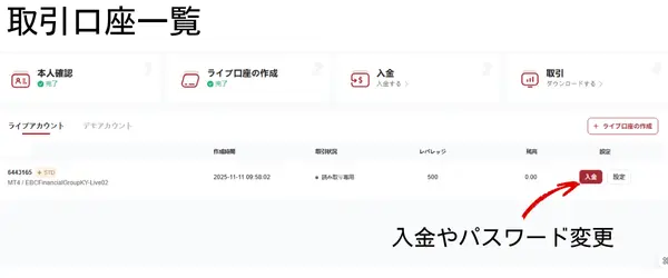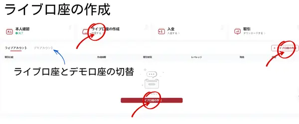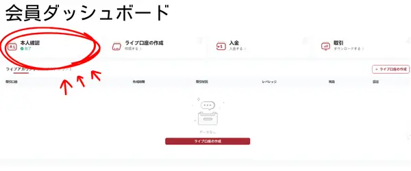 本人確認の審査が完了すると、会員ページのダッシュボードでライブ口座(本取引口座)の開設ができるようになります。