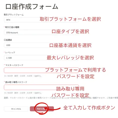 - 口座タイプ: STD口座またはPRO口座を選択(次のセクションで詳しく解説)