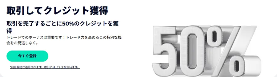 | 50%リベートボーナス | スプレッドの50%分のボーナス | 終了日未定 |