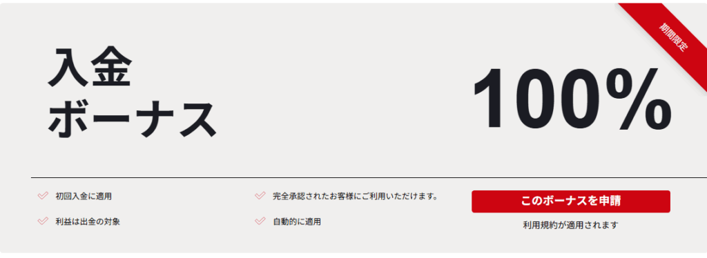 (期間中の合計ではなく初回入金分のみ) - 口座承認が未完了だと100%ボーナスは付与されない