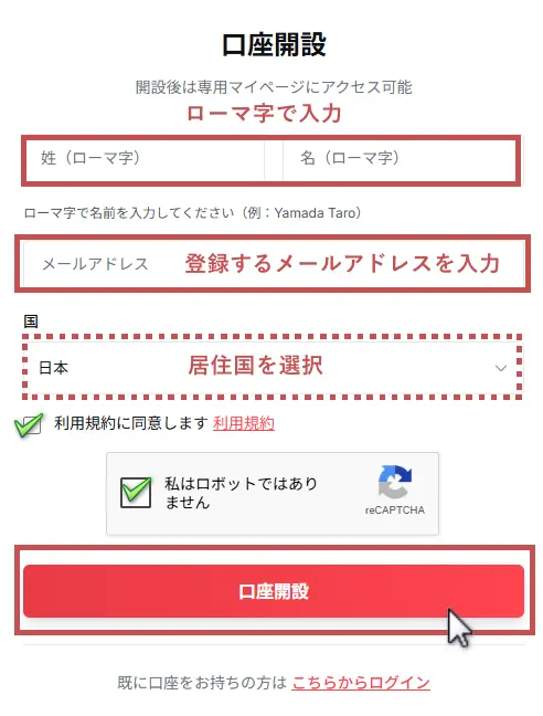 移動すると口座開設フォームが表示されるので、項目に沿って必要事項を入力します。