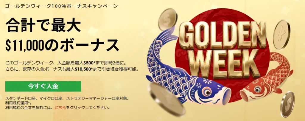 ゴールデンウィーク期間中、入金額が最大$500まで2倍になる期間限定の100%入金ボーナスキャンペーンです。既存の入金ボーナスと合わせると最大$11,000のボーナスを獲得できます。